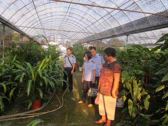 为强化植物检疫执法,严厉打击违法违规生产、调运、销售、加工和种植未经检疫的植物或植物产品的行为,促进文明执法、规范执法和区域联合执法,防止植物疫情传播蔓延,确保农业生产安全,自治区植物检疫联合执法检查组第3组(负责桂林、柳州、来宾区域)在自治区植检站李菁专家的带领下于2012年9月12-13日到我市开展植物检疫执法检查工作,检查组先后到柳江县成团镇草皮培育基地、柳江县洛满镇柑桔生产基地、柳州市园林苗木生产繁育基地进行检查,检查组听取了有关负责人的介绍并详细了解了绿化草皮、花卉苗木、柑桔生产的调运、销售和检疫情况,同时对基地内检疫性病虫害发生情况开展了全面的检疫检查。