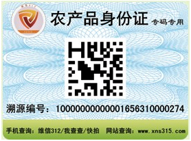 相关链接:"农产品身份证"生产溯源标签由中国国际电子商务中心诚信农商网推出,是农产品生产溯源系统服务应用,标签上的二维码通过智能手机安装二维码识别软件,如维信312、我查查、快拍等客户端即可扫描,也可登录诚信农商网(www.xns315.com) 查看更加详细的生产溯源。