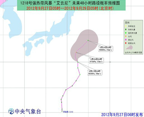 今年第18号强热带风暴“艾云尼”的中心27日05时位于日本东京南偏东方大约680公里的西北太平洋洋面上,就是北纬30.0度、东经142.5度,中心附近最大风力有10级(28米/秒),中心最低气压为985百帕。