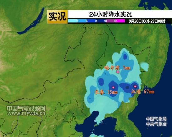 受到冷空气东移影响,北方的降雨重心从27日的内蒙古东南部、辽宁,转移到28日的吉林中东部地区,其中,大到暴雨的站点有吉林汪清67mm、敦化59mm、图们49mm、辽源49mm等。汪清67mm的单日降雨量超过了此前2000年9月16日61.6mm的单日降雨纪录,敦化59mm的降雨量也是当地9月下旬少见。