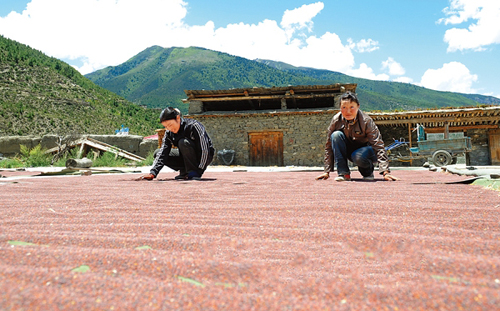 图为近日该镇拉康村的两位村民正在晒油菜籽。
