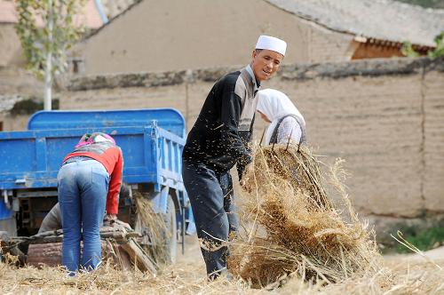 在宁夏回族自治区西吉县兴平乡的打谷场,农民正在将刚收割的谷物扬场。今年,宁夏秋粮播种面积共976.4万亩,较上年增加42.4万亩,预计秋粮产量约298.8万吨,比上年增加约5.4万吨。截至目前,全区国有粮食收储企业累计收购稻谷6.23万吨,比2011年同期多收5.3万吨,收购量为近年来同期最高水平。