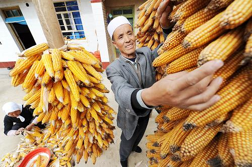 在宁夏回族自治区西吉县兴平乡当地农户家中,农民正在晾晒成捆的玉米。