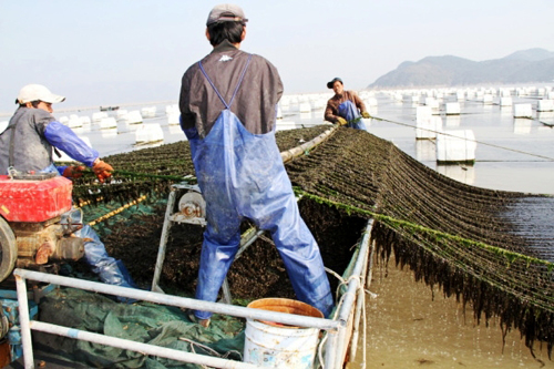 同时由于养殖海区有限,造成养殖密度过高,病害和用海纠纷时有发生。为了缓解用海矛盾、拓展养殖空间,县水产科研部门积极开展紫菜全浮流养殖技术研究和推广,面积正在逐步扩大,今年紫菜全浮流养殖示范园区第一水紫菜喜获丰收,并采用机械化采收,2012年10月23日,科技人员现场测产得出每行(5米*92米)可收鲜菜350Kg左右。