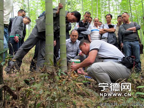竹子打一针,多子又多孙。日前,在屏南县屏城乡南峭村毛竹林里,来自该县各乡镇分管林业领导,林业站负责人以及中央彩票公益金支持革命老区创新试点项目村主干60多人,把一位手持针筒的人给围得水泄不通,只见那人往竹腔钻孔、注射“药水”、抹泥。你可别以为他是医生,更不要以为竹子得病了,他是江西省林业科学院竹类研究所研究员,正在教当地林农为竹子实施毛竹竹腔施肥丰产技术。