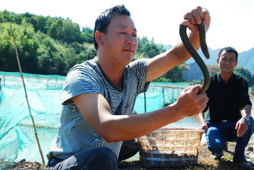 连日来,大同镇劳村村村民夏余平采用池塘网箱养殖黄鳝,预计今年有5万公斤可投放市场。