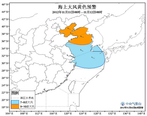 新农网讯 中央气象台11月11日18时继续发布海上大风黄色预警,预计11日20时至12日20时,受温带气旋和较强冷空气的共同影响,渤海海峡、黄海北部和中部海域将有9级、阵风10~11级的西北风,渤海、黄海南部海域将有7~8级、阵风9~10级的西北风。