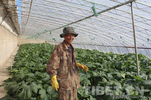 见我们对他正在繁育的西红柿苗很感兴趣,他干脆带着我们参观了他的几座大棚。温暖如春的大棚里,半人高的西红柿已经结出了青色的果实,辣椒也已经开始坐果,硕大的南瓜和西葫芦随处可见。罗布告诉我们,西葫芦两天摘一次,他今天刚刚采摘了一茬,足有四百多斤,而他种植的辣椒可以卖到4.5元一斤,仅此一项就能有近三万元的收入。