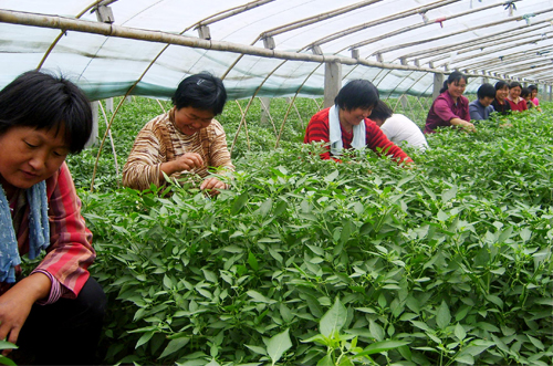 近年来,敬安镇蔡刘庄村不断加大制种辣椒新品种、新技术的研发推广力度,积极与杭州、上海等地的种子公司及江苏农科院等科研机构开展研发合作,成功培育出沛椒抗1号、苏椒抗5号等20余个制种辣椒新品种,使村民年人均创收2万余元。图为村民在管理制种辣椒。