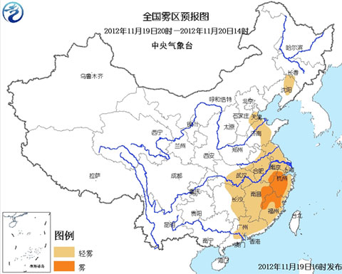 中央气象台11月19日18时继续发布大雾蓝色预警: