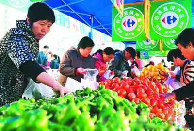 11月17日,合肥市民在“农超对接直销菜场”选购低价蔬菜、水果。当日,合肥市长江西路一家大型连锁超市在门前广场搭建“农超对接直销菜场”,新鲜时令的当地产果蔬价格平均低于市场价格的30%至50%。农超对接既方便农民卖菜,又惠及市民。