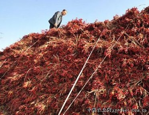 11月16日,山西省临汾市襄汾县赵康镇赵雄村三樱椒种植大户张旭新在查看堆积如山的三樱椒。入冬以来,山西晋南临汾、运城等10多个县市的三樱椒辣椒喜获丰收。而在山西晋南三樱椒产供销基地临汾市襄汾县赵康镇赵雄村三樱椒市场,目前价格每市斤3.7元到4元左右,比去年下滑约50%,全国各地的客商迟迟不来收购,冷清的市场让椒农们心急如焚。