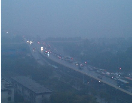 今晨南昌降雨至八一大桥路段出现交通拥堵。(图片来源:新浪微博)