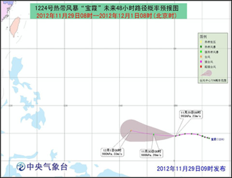 新农网讯 今年第24号热带风暴“宝霞”的中心11月29日08时位于关岛南偏东方大约1150公里的西北太平洋洋面上,就是北纬4.5度,东经150.2度,中心附近最大风力9级(23米/秒),中心最低气压995百帕。