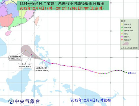 新农网讯 今年第24号超强台风“宝霞”于12月4日下午减弱为强台风,17时其中心位于菲律宾保和海海面上,就是北纬9.0度,东经123.4度,中心附近最大风力15级(48米/秒),中心最低气压945百帕。