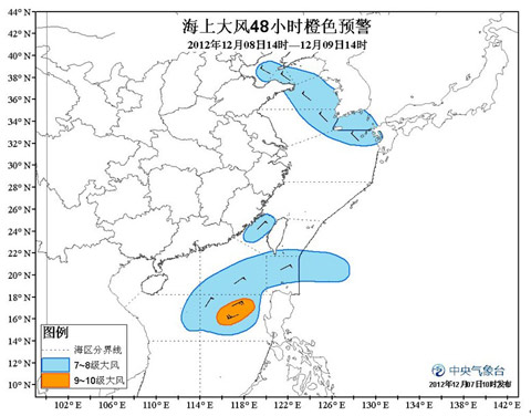 中央气象台12月07日10时继续发布海上大风橙色预警:
