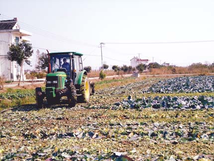 岔河镇加快千亩设施园区建设,在去年400亩的基础上,今年又在新坝村流转土地680亩,吸引东台种植能手来村发展设施蔬菜大棚。前不久,一批卷心菜上市,眼下即将开始搭建大棚,播种西瓜。图为农户正在粉碎卷心菜的茎和叶。