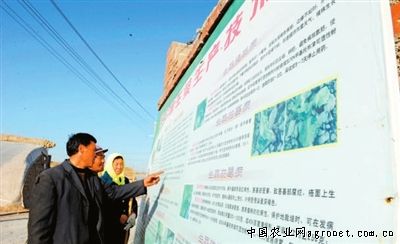 在银川市金凤区良田镇生态移民村和顺新村,几位村民正在通过温棚外的科普展板学习无公害蔬菜生产技术。金凤区农牧部门将设施农业种植技术分门别类制作成大型科普展板,悬挂在温棚外侧,供移民群众参考、学习,成为农民们的“良师益友”。
