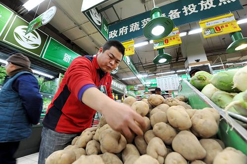 12月18日,在宁夏银川一家超市的政府储备蔬菜投放点,工作人员在将投放的储备土豆摆上货架。