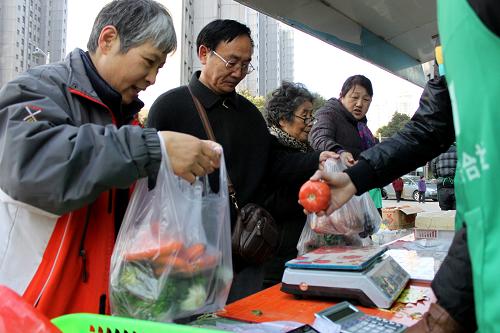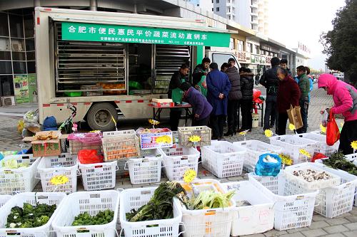 12月19日,市民在平价蔬菜流动车旁购买蔬菜。当日,平价蔬菜流动车来到合肥市笔架山街道天鹅湖畔小区,为居民提供新鲜且便宜的蔬菜、粮油、肉类、禽蛋等。据悉,合肥市总投资900万的50辆平价蔬菜流动车将于12月21日全面启动,100个小区的居民将在家门口享受到平价蔬菜流动车服务。按照合肥市要求,流动车每天经营时间不少于6小时,蔬菜品种不少于20个,蔬菜销售价格要低于市场平均价格的20%以上。