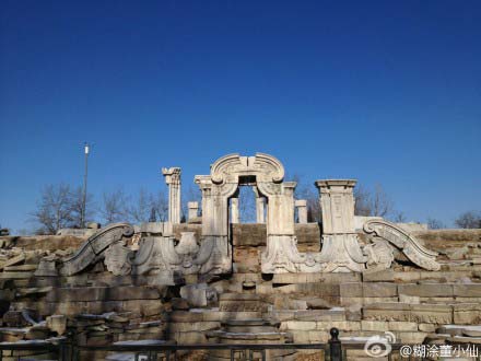 以蓝天为背景的北京圆明园。(图片来源:新浪微博 @糊涂董小仙)