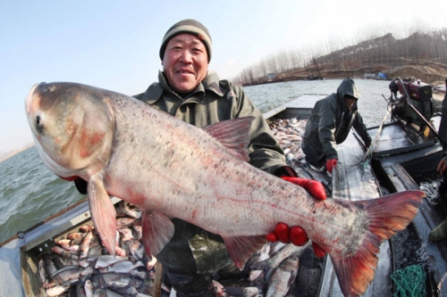 12月23日,江苏省赣榆县塔山镇养殖户展示捕捞的一条重达13.5公斤的大鲢鱼。