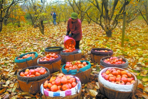 图为日前恭城莲花镇群众在柿园里收摘月柿。