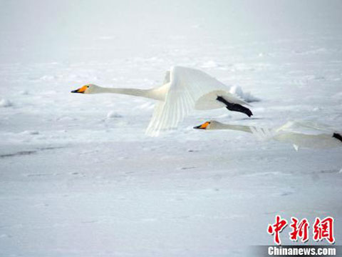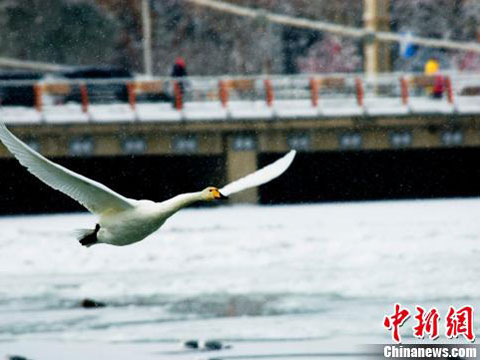 天鹅在飞舞的雪花中展翅飞翔。 韩峻 张欢 摄
