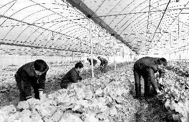 屏南县岭下乡引进福建高山蔬菜大棚集蔬菜避雨栽培、滴(喷)灌、水肥一体化于一体。公司以优惠的条件把示范基地反租给周边菜农,按公司“无公害”流程标准种植娃娃菜、黄瓜等优质精品蔬菜。图为蔬菜大棚内,菜农们正在除草。