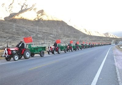 为了向贫困农牧民群众送去党的关怀,帮助农牧民群众更好地走上致富道路,近日,自治区创先争优强基惠民活动驻当雄县羊八井镇桑巴萨居委会工作队(自治区国土资源厅派驻)多方筹集资金42.9万元,购置了22台四轮拖拉机,捐助给村中22户贫困家庭。 图为22户牧民群众驾驶着拖拉机从拉萨返回村中。