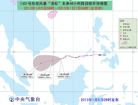 今年第1号热带风暴“清松”(Sonamu)的中心5日08时位于海南省三沙市以南大约950公里的南海南部海面上,就是北纬8.3度、东经111.9度,中心附近最大风力有9级(23米/秒),中心最低气压为992百帕。