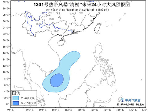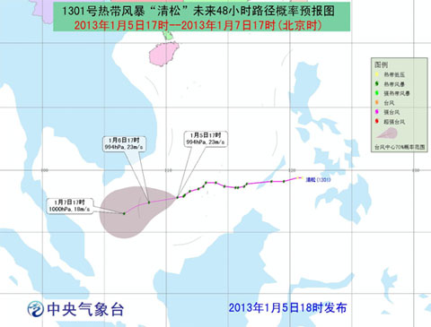 今年第1号热带风暴“清松”(Sonamu)的中心5日17时位于海南省三沙市以南大约1010公里的南海南部海面上,就是北纬7.8度、东经110.9度,中心附近最大风力有9级(23米/秒),中心最低气压为994百帕。
