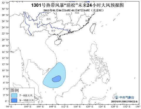 今年第1号热带风暴“清松”(Sonamu)的中心6日08时位于海南省三沙市以南大约1100公里的南海南部海面上,就是北纬7.2度、东经110.0度,中心附近最大风力有9级(23米/秒),中心最低气压为994百帕。