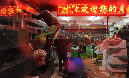凌晨5时许,店员们还没来得及休息,很多顾客已经上门选购海鲜。一名店员从鱼缸里捞出客人挑选的多宝鱼,再将活蹦乱跳的多宝鱼装进充满氧气的大塑料袋里。向塑料袋里加水,将塑料袋绑好,把称过重的多宝鱼交给顾客……完成这一系列动作后,店员的双手已经被冻得通红。