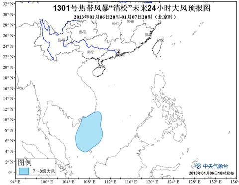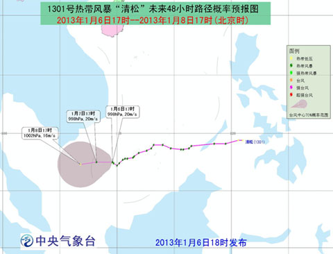 今年第1号热带风暴“清松”(Sonamu)的中心6日17时位于海南省三沙市南偏西大约1070公里的南海南部海面上,就是北纬7.5度、东经109.6度,中心附近最大风力有8级(20米/秒),中心最低气压为998百帕。