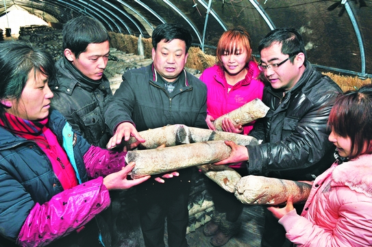1月9日,凤台县农技人员(左三)在永望食用菌专业合作社指导社员科学种植食用菌。近年来,永望社采取“合作社+基地+农户”的模式,带动1200多户农民种植食用菌。 2011年,合作社实现销售收入1722万元,社员收入超出地方人均收入50%,被授予“全国农民专业合作社示范社”、安徽省和淮南市农民专业合作社示范社。
