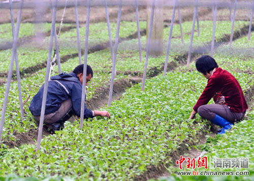 受寒冬和叶菜种植面积减少等因素影响,入冬以来,海南菜价居高不下。侨乡琼海市采取政府补贴一点,菜农出一点的办法,筹集资金推广大棚蔬菜,并在超市和主要农贸市场建起5个蔬菜直销平价区,确保蔬菜正常供应。尽管近日持续低温,菜农仍在大棚里赶种蔬菜。
