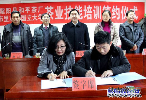 1月11日,紫阳县和平茶厂与俄联邦布里亚特国立大学正式签订合作协议,双方将互派访问团开展茶文化交流活动,为紫阳富硒茶走向欧洲市场开启窗口。市商务局长罗万平,副县长任红艳,县政府党组成员、县总工会主席李龙安,俄联邦布里亚特国立大学代表丽达女士出席签约仪式。