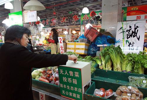 近日,蔬菜无人销售点在上海市普陀区蓝田、华池两家菜场亮相,顾客按照1元、2元、3元、4元不同的分区按件选菜,自己投币到投币箱。蓝田菜场销售点的相关负责人告诉记者,他们原本预期大概70%的人会讲诚信,这样刚好能够保本;事实经过核算,有95%的顾客是讲诚信的。新华社发 (丁汀 摄)