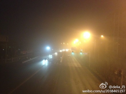 29日早晨,通往北京南站的路上有雾,能见度不佳。(图片来源:新浪微博)