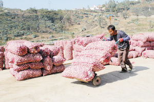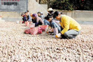 离吴应明的蒜场不远处,村民们正在对分拣好的大蒜进行打包。大约20分钟后,一辆贵州牌照的大卡车开过来,两个村民开始往2辆手推车上装蒜。村民说,早上已经发走了20多吨,像这样的场地,村子里大概有20多块。50多岁的张大妈笑着把150元钱装进口袋,“这是我两天的工钱,明天忙不得来装了,我家的蒜也要开始挖了。”张大妈说,挖蒜的季节,村子里根本就找不到闲着的人,就连70多岁的老人也来跟着拣蒜,一天至少有50元的收入。