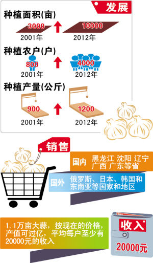 在政府产业政策和市场调控双重因素的影响下,东川大蒜产业规模不断扩大,种植面积已由2001年的3000多亩发展到2012年的有10000多亩,参与大蒜种植的农户由2001年的800户增加到近4000户,大蒜平均亩产也由原来的900公斤提高到目前的1200公斤。同时,每年通过东川大蒜协会、东川阿旺蔬菜协会等专业合作组织的销售网络,使产品远销到黑龙江、沈阳、辽宁、广西、广东等省,部分还出口到俄罗斯、日本、韩国和东南亚等国家和地区。1.1万亩大蒜,按现在的价格,产值可过亿,平均每户至少有20000元的收入,成为当地农民增收致富的重要支柱产业。
