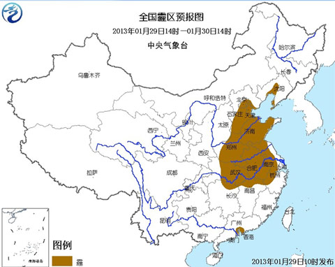 中央气象台1月29日06时继续发布大雾蓝色预警: