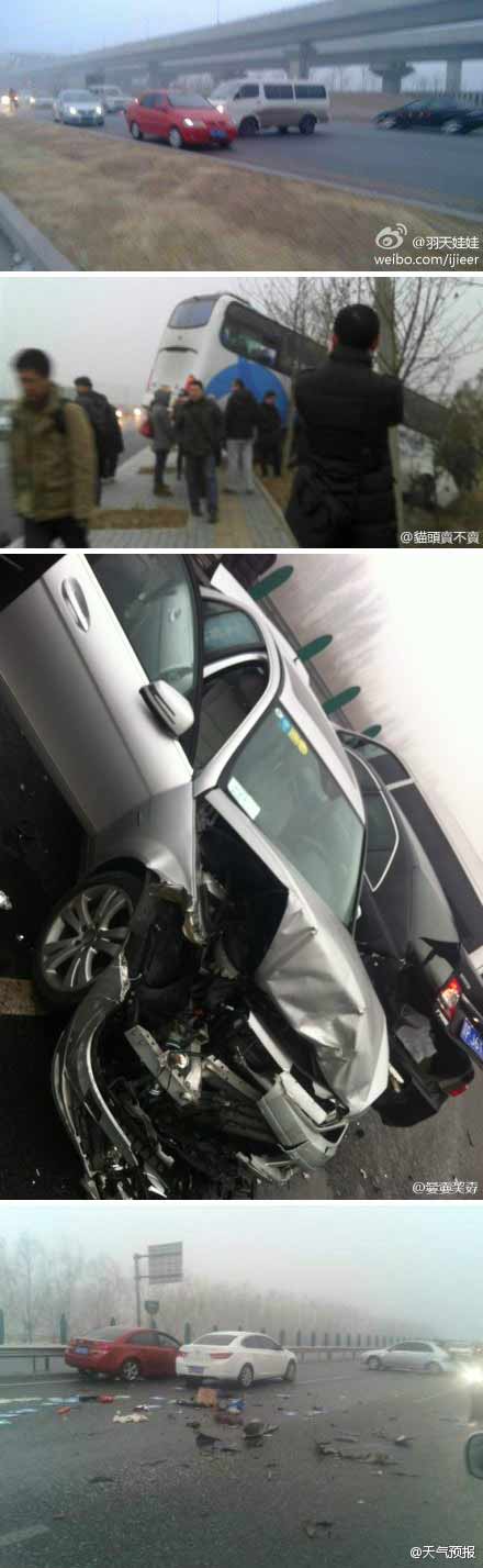 北京复杂的天气给交通带来了十分不利的影响。据微博网友反映,由于北京雾霾不散,能见度差,加上路面相当滑,车辆易打滑,京承高速已发生数十起车祸,机场高速双向约有50辆车连环车祸。