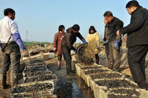 由于该合作社实行科学、绿色养殖,精心管理,养殖的?蛏优质高产,亩产量达到2500多公斤,亩产值7万多元。目前正是?蛏产销旺季,精品装一盒2.5公斤的?蛏卖130元,畅销上海、杭州、宁波、福建和台州等地,客户纷纷来电订购,供不应求。图为1月16日杭州客户到该合作社购买?蛏。