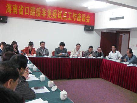 会议由兽医处李处长主持,省动物疫病预防控制中心、省动物卫生监督所有关领导,海口、儋州、琼海、三亚、五指山、琼中六个市县畜牧兽医局局长、业务副局长、动物疫病预防控制中心主任、动物卫生监督所所长参加会议,会议日期半天。