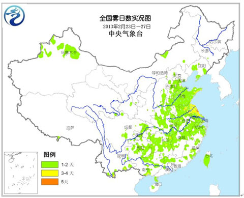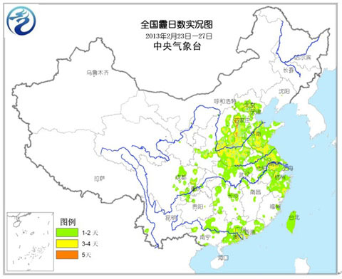 持续时间长:23日至27日,山东北部和半岛、江苏中北部、浙江北部等地部分地区出现3~5天的雾;陕西中部、山西东部和中南部、河北中南部、北京、天津北部、河南、山东北部和西部、安徽中北部、江苏等地部分地区出现3~5天的霾。
