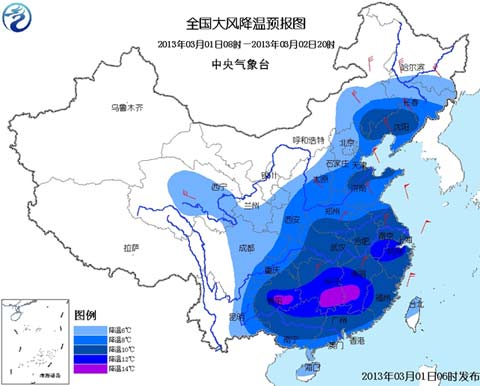 中央气象台3月1日06时继续发布寒潮蓝色预警: