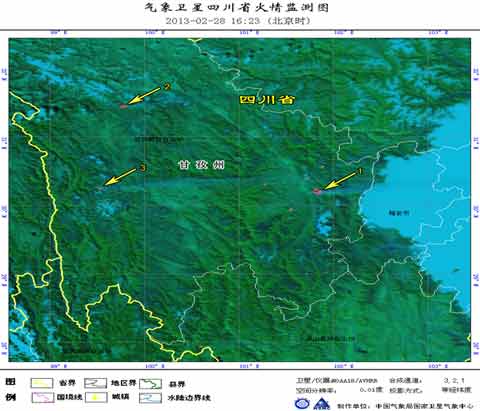 气象卫星监测四川省火情监测图(2013年2月28日16时23分)