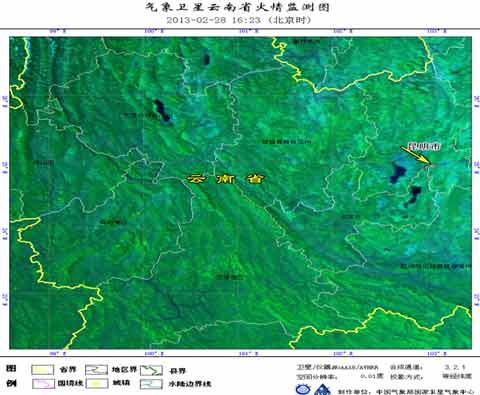 气象卫星监测云南省火情监测图(2013年2月28日16时23分)